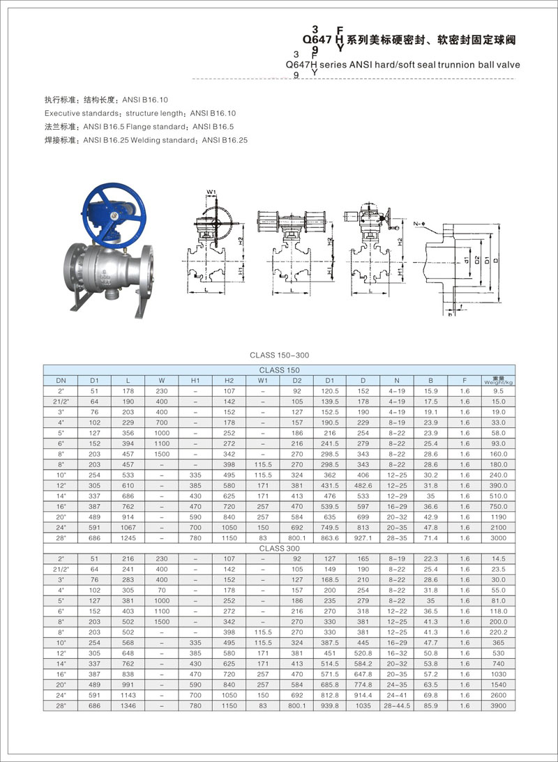 The Q647H series ANSI hard/soft seal trunnion ball valve is engineered to meet ANSI standards, ensuring precision, reliability, and durability for industrial applications. Available in sizes ranging from 2″ to 28″, with pressure classes of 150 and 300, it offers exceptional sealing performance for various operating conditions. Designed with compliance to ANSI B16.10 (structure length), B16.5 (flange standards), and B16.25 (welding standards), this valve provides robust construction, superior corrosion resistance, and smooth operation. Its versatile design makes it suitable for handling high pressures and flow rates, ensuring optimal performance in demanding environments.
